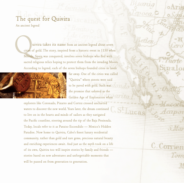 As development started, we launched the opening of the community with a website and booklet that communicated how Quivira offered the richness of life to those who embraced the same adventurous spirit of past explorers looking for the lost city of gold.