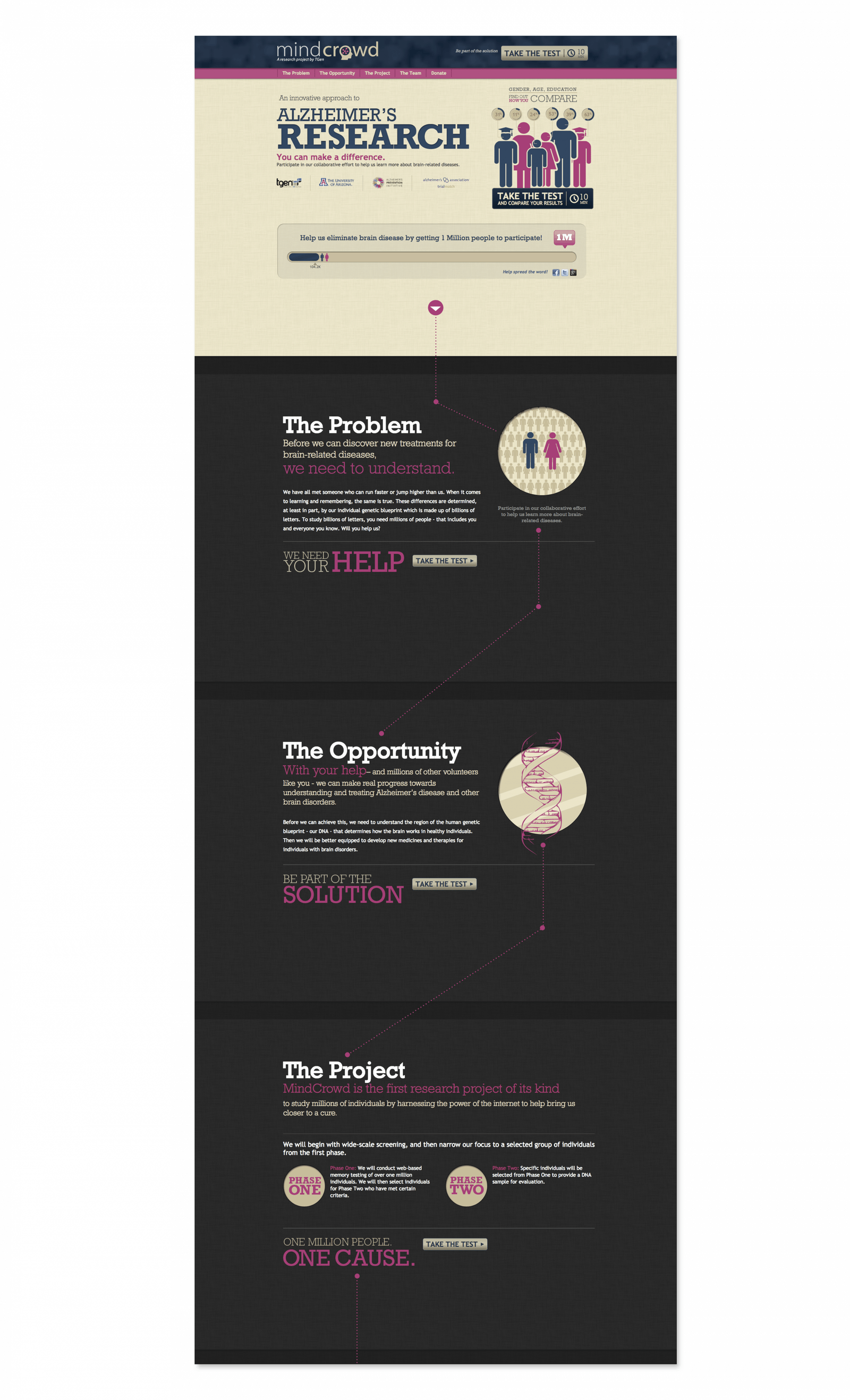 MindCrowd is an online crowdsourcing initiative from Translational Genomics Research Institute (TGen). By harnessing the Internet to reach people worldwide, researchers hope to find and sign up 1 million participants in its study on how genetics influences memory. Their goal is to gain a better understanding of brain disorders like Alzheimer’s disease.